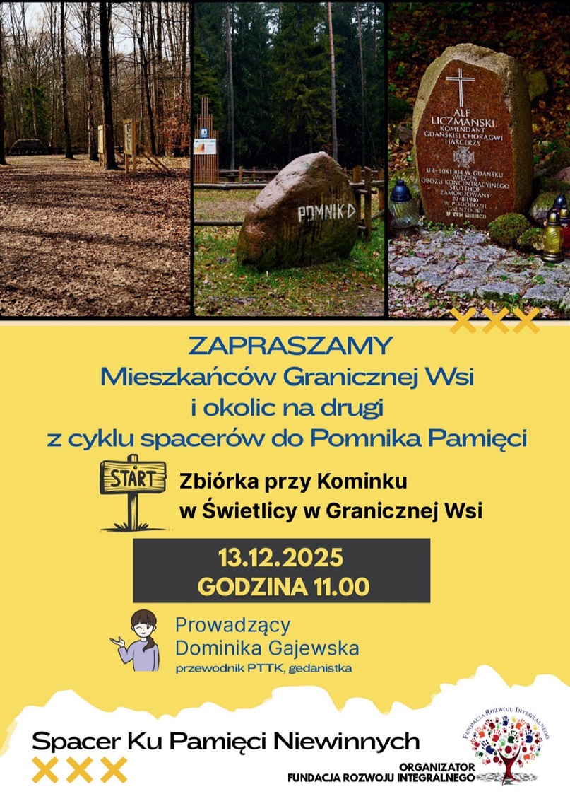 Z kolei o godzinie 11:00 w Granicznej Wsi odbędzie się spacer „Ku Pamięci Niewinnych”. Zbiórka zaplanowana jest przy Kominku – świetlicy wiejskiej. Spacer poprowadzi Dominika Gajewska, przewodnik PTTK, która przybliży uczestnikom lokalną historię oraz znaczenie Pomnika Pamięci.