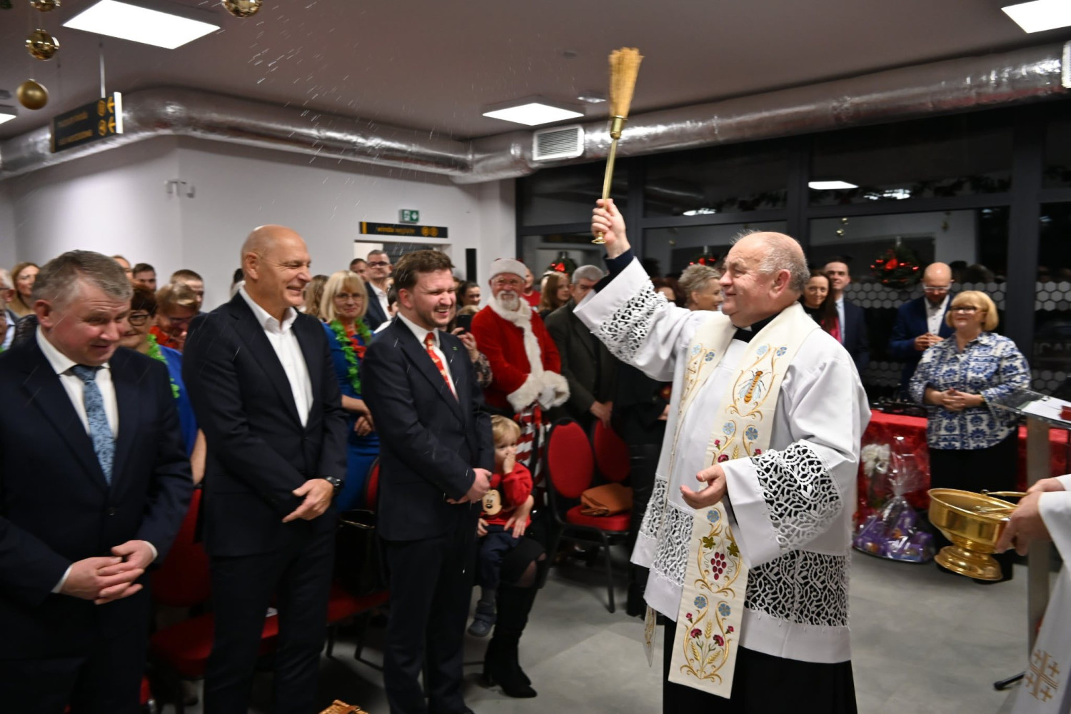 Po tradycyjnym przecięciu wstęgi nastąpiło poświęcenie budynku, którego dokonał proboszcz parafii pw. Najświętszego Serca Pana Jezusa w Pszczółkach ksiądz Józef Urban.