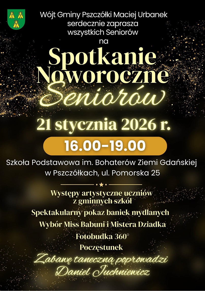 Szanowni Seniorzy! Z ogromną przyjemnością zapraszam Państwa na Spotkanie Noworoczne Seniorów. To doskonała okazja, aby wspólnie powitać nowy rok, spędzić czas w miłej atmosferze i cieszyć się pięknymi występami naszych młodszych mieszkańców gminy. Do zobaczenia 21 stycznia w szkole w Pszczółkach!