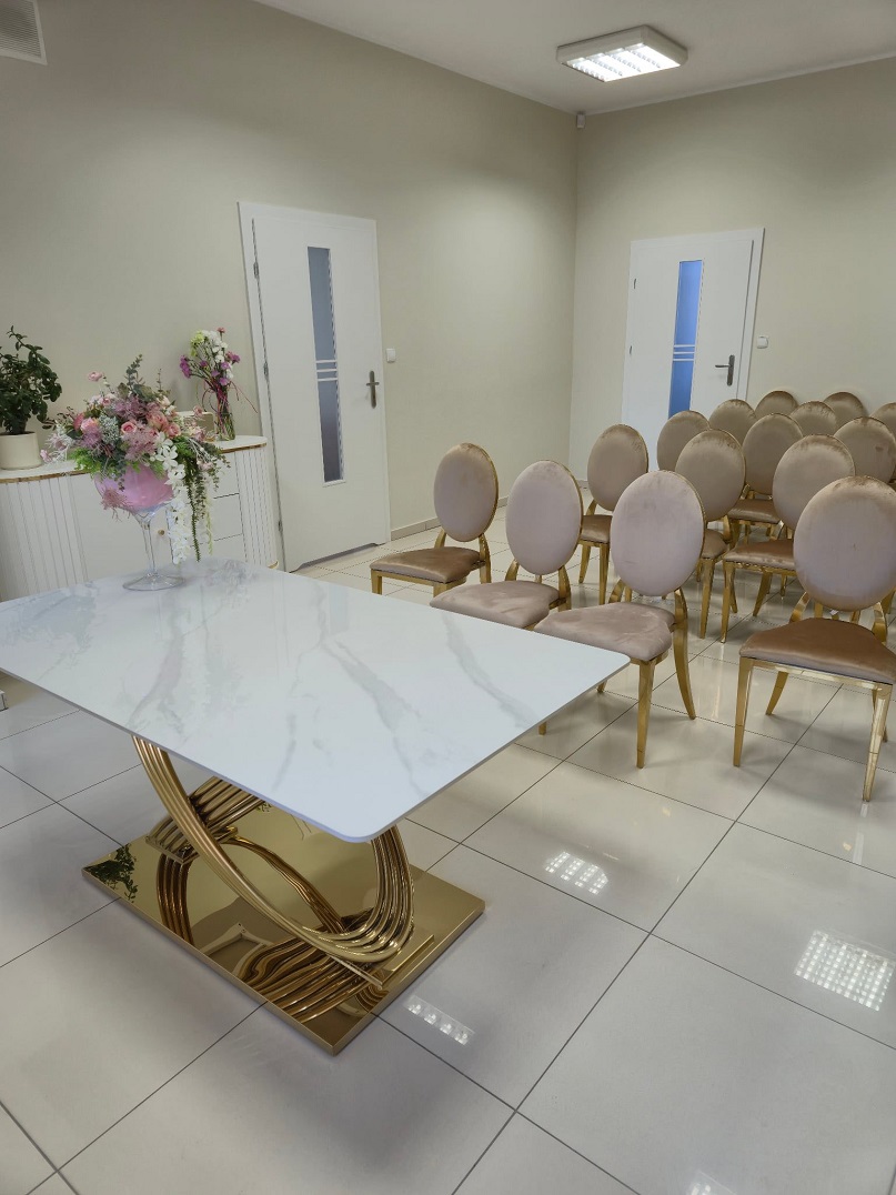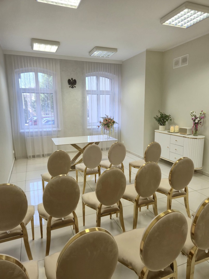 Centralnym elementem sali jest nowy stół z efektowną podstawą, przy którym Pary Młode – w obecności kierownika Urzędu Stanu Cywilnego – składają przysięgę małżeńską. Przestrzeń została zaprojektowana tak, aby podkreślać rangę chwili i tworzyć atmosferę sprzyjającą wzruszeniom oraz celebrowaniu jednego z najważniejszych momentów w życiu.