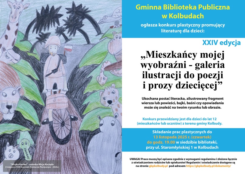 Prace plastyczne można składać do 13 listopada 2025 r. (czwartek) do godz. 19.00 w siedzibie biblioteki przy ul. Staromłyńskiej 1.