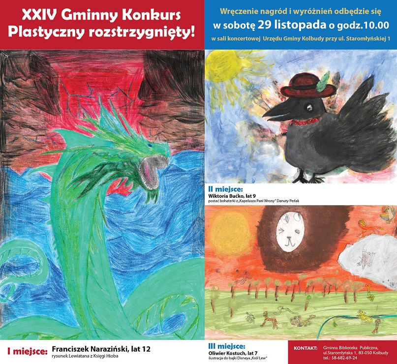 Uhonorowanie laureatów XXIV Gminnego Konkursu Plastycznego: wręczenie nagród i wyróżnień oraz wernisaż nagrodzonych prac, odbędzie się 29 listopada 2025 r. o godz. 10.00 na sali koncertowej Urzędu Gminy Kolbudy. Autorzy nagrodzonych prac, którzy nie będą mogli uczestniczyć w Gali Laureatów mogą skontaktować się: 58-682-69-24 w godzinach pracy biblioteki począwszy od poniedziałku 1 grudnia br.