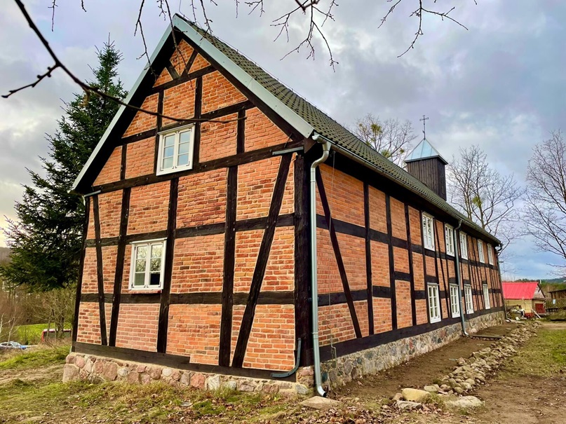 Wpisany do Rejestru Zabytków Województwa Pomorskiego kościół posiada konstrukcję szkieletową wypełnioną murem ceglanym i posadowiony jest na niskiej podmurówce z kamieni polnych.