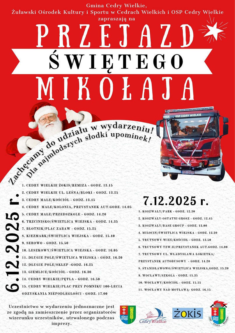 6 grudnia Mikołaj odwiedzi m.in. Cedry Wielkie, Cedry Małe, Trzcinisko, Kiezmark, Błotnik, Leszkowy, Długie Pole i Giemlice.