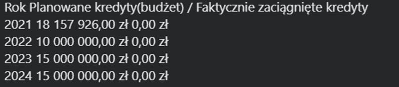 Przez cztery lata nie zaciągnęliśmy żadnego kredytu komercyjnego, mimo że budżety przewidywały taką możliwość. To standardowe narzędzie planistyczne, które pozwala rozpocząć inwestycje wcześniej i uzyskać korzystniejsze ceny wykonawstwa. W praktyce przełożyło się to na brak konieczności kredytowania.