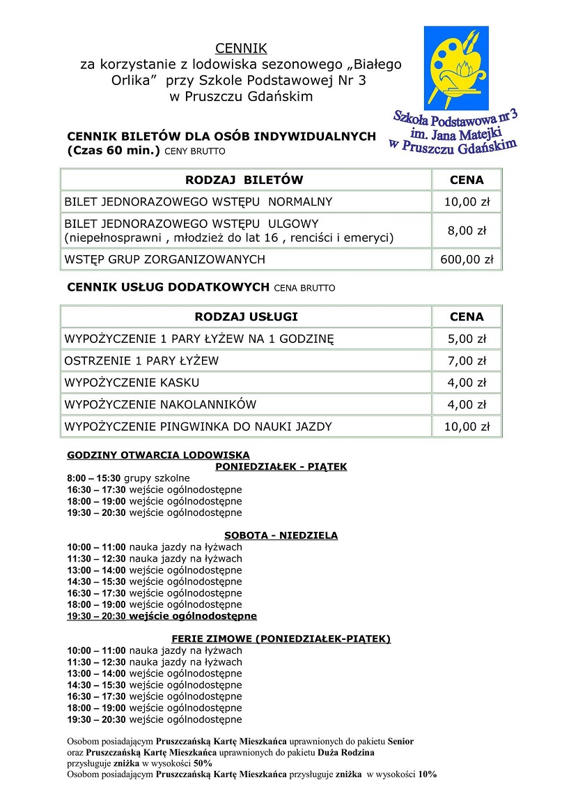 Cennik oraz szczegółowe godziny wejść dostępne są na załączonym materiale informacyjnym.