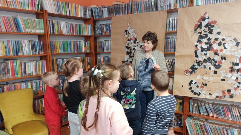 Na koniec spotkania przedszkolaki wykonały wspólną pracę plastyczną – portret kota, a także miały okazję oglądać wybrane przez siebie książeczki.