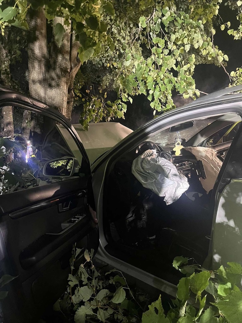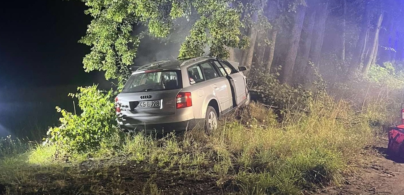 Samochód osobowy po wypadnięciu z jezdni uderzył w przydrożne drzewo.