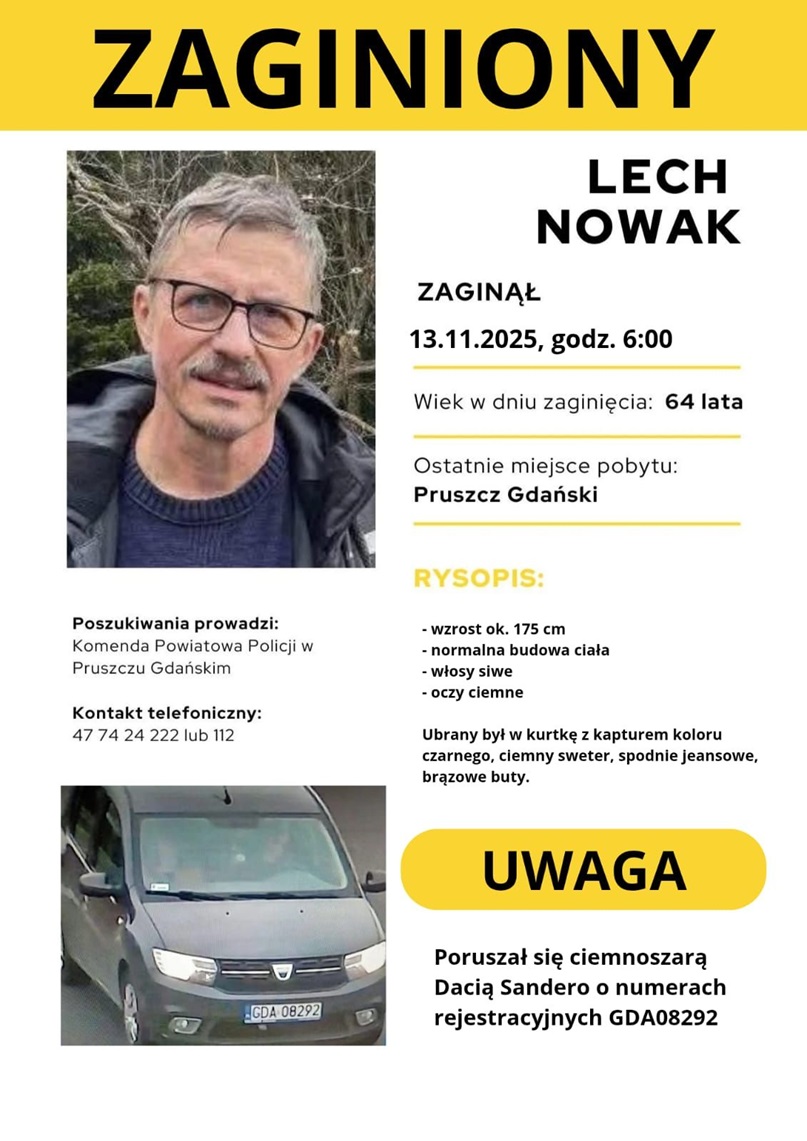 Trwają poszukiwania 64-letniego Lecha Nowaka, mieszkańca Pruszcza Gdańskiego, który rankiem 13 listopada wyjechał z domu do pracy i do tej pory nie skontaktował się z rodziną.